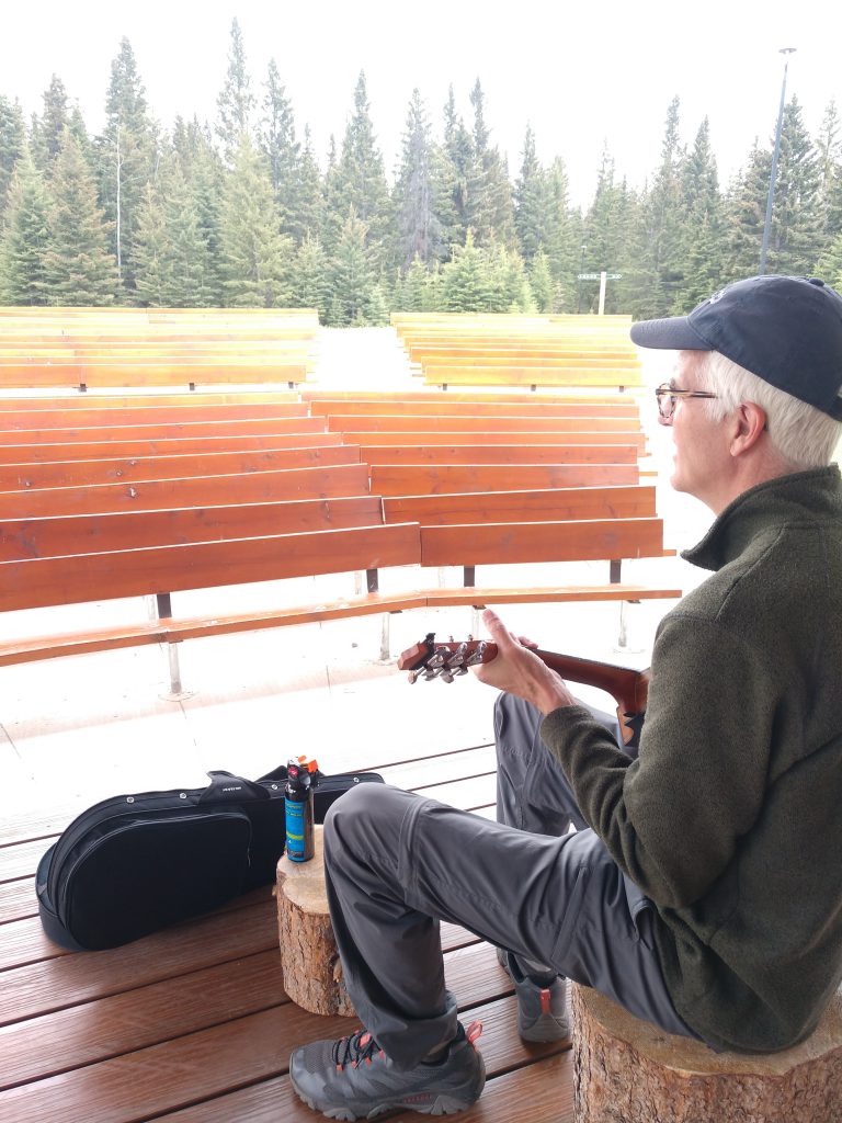 Ranger talks postponed from this beautiful Jasper campground ampitheatre so Dave took to the stage prepared with bear spray. Promoting music with children in Banff, AB.Tangle Creek Falls along the Icefield Parkway makes music 24/7.
